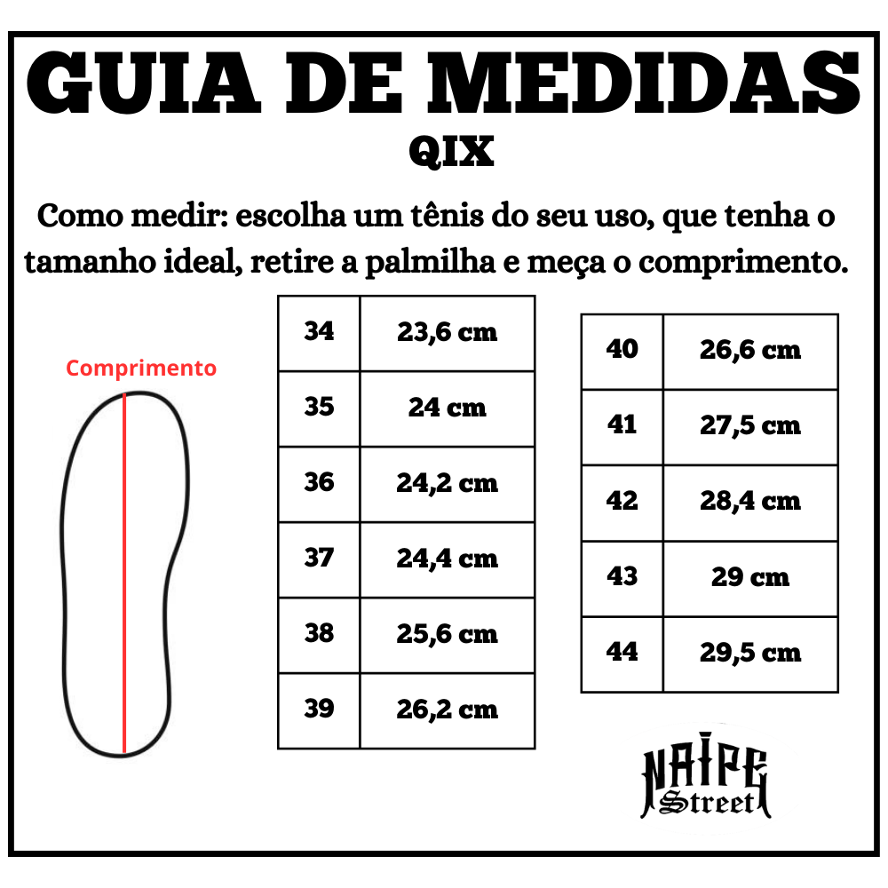 Confira o guia de medidas e escolha o seu tamanho ideal para aproveitar todo o conforto e autenticidade do Tênis Qix Plaza!
